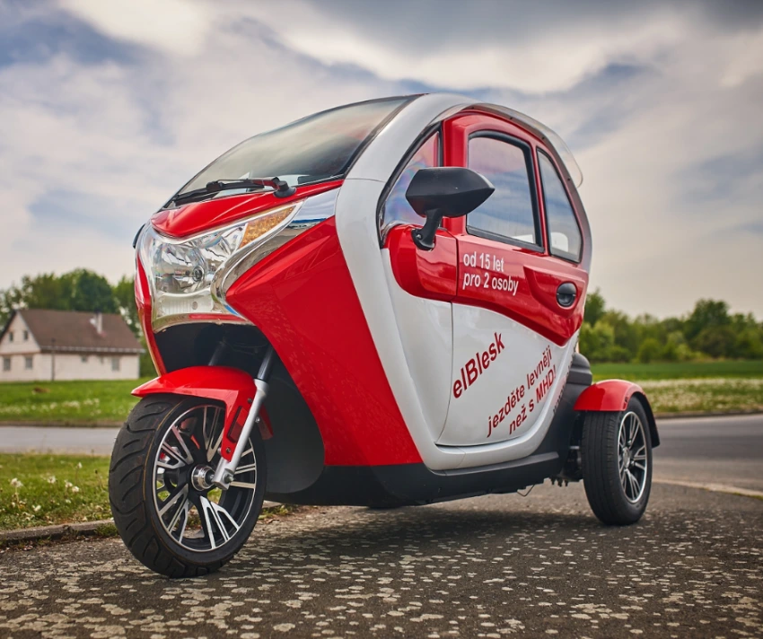 Pohodlně, v teple a suchu za jakéhokoli počasí. Tříkolka ELBLESK se nepřevrhne díky rozšířeným kolům mimo karoserii.